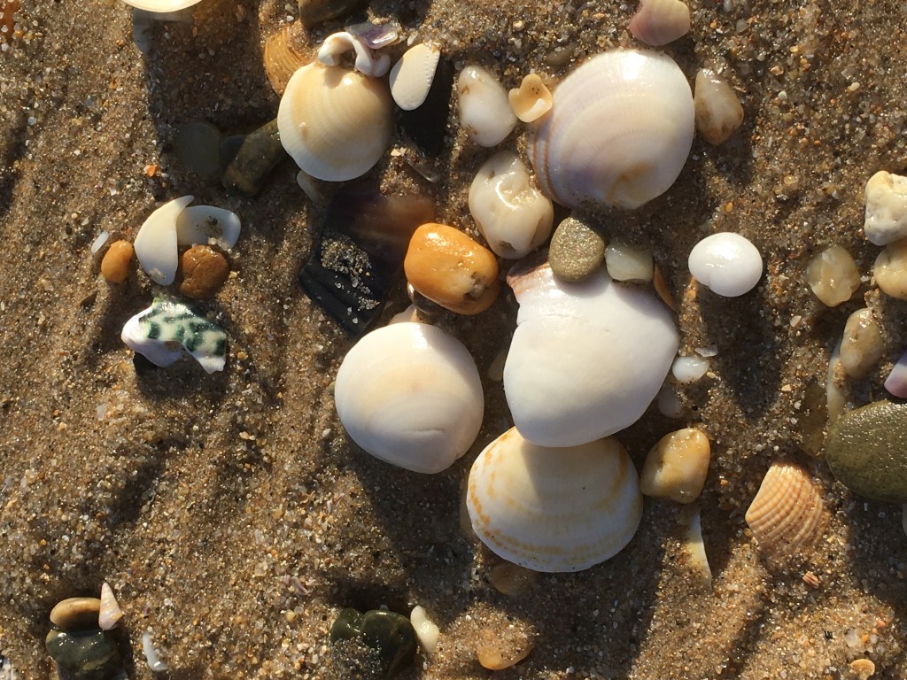 Shells. Shells. Shells. Skipping stones.