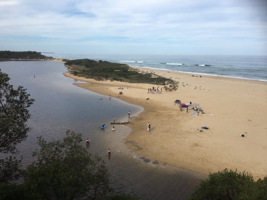 Yeerung River estuary has a calm swimming area. Great for families. Lots of Esky’s and blow up floaty toys and canoes scattered the sand and water, a colourful scene reminiscent of a work place picnic. You have to drive to this location and parking is limited.