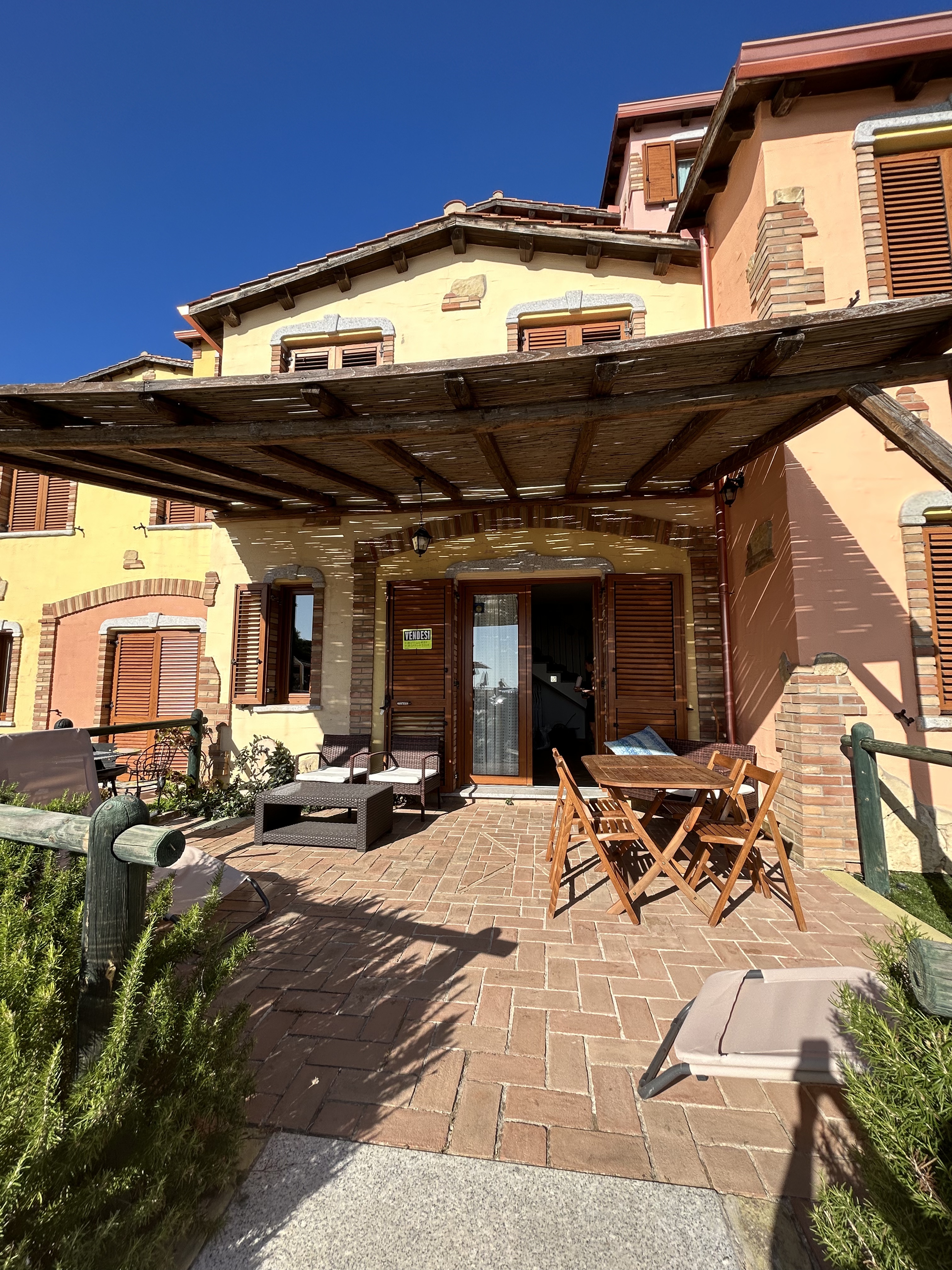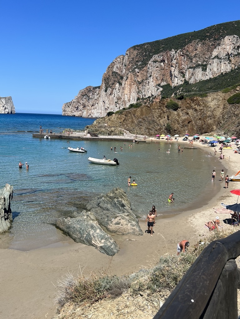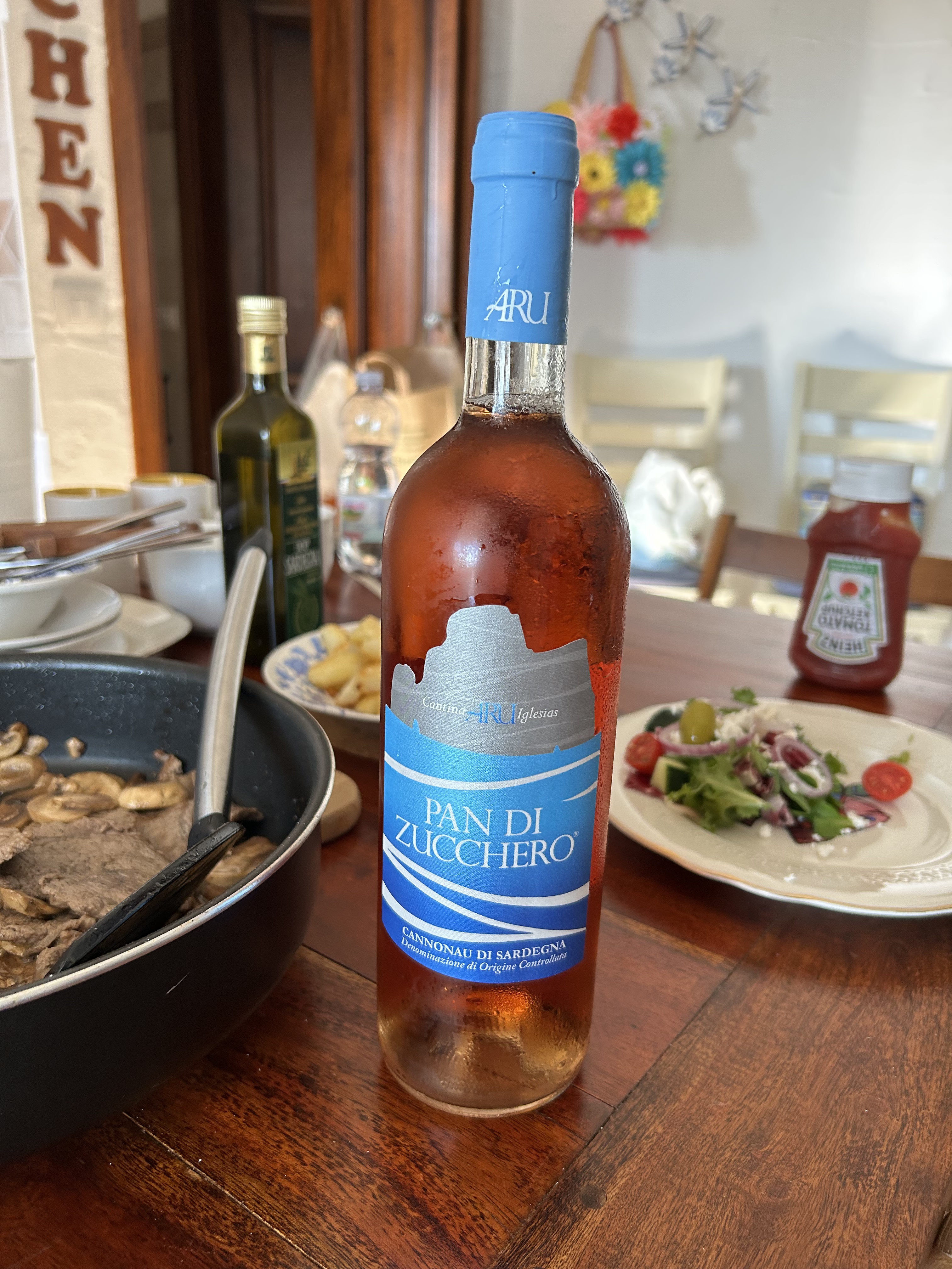 Aligia Chalet was an interesting resort style accommodation perched up high above a beautiful view of the sea. We were fortunate to have one of the few ground floor, poolside apartments with a covered patio. And it had had excellant air conditioning, absolutely an essential as we were hit by an ongoing heatwave during our stay. The host gave us a bottle of local wine named after the monolithic rock Pan di Zucchero visible just off the coastline and some Sardinian crispy thin flatbread – Pane Carasau. A lovely welcome.