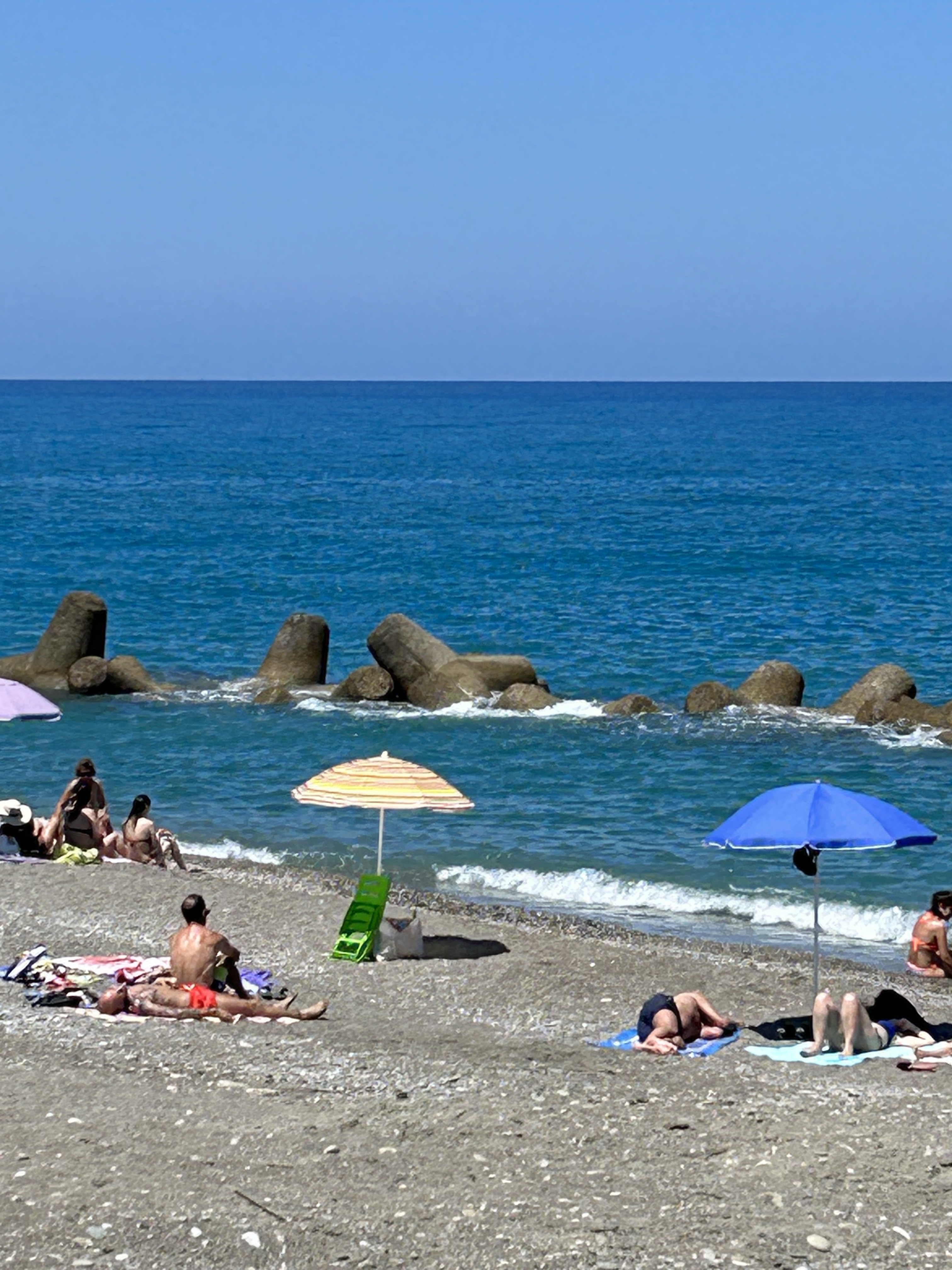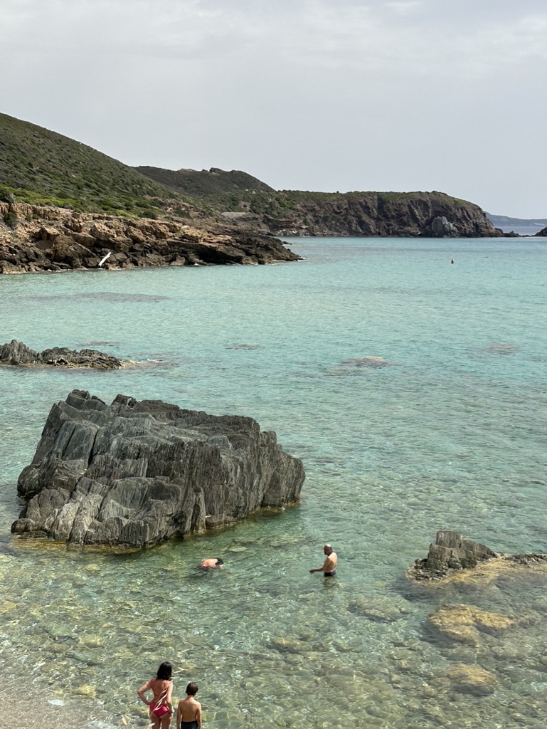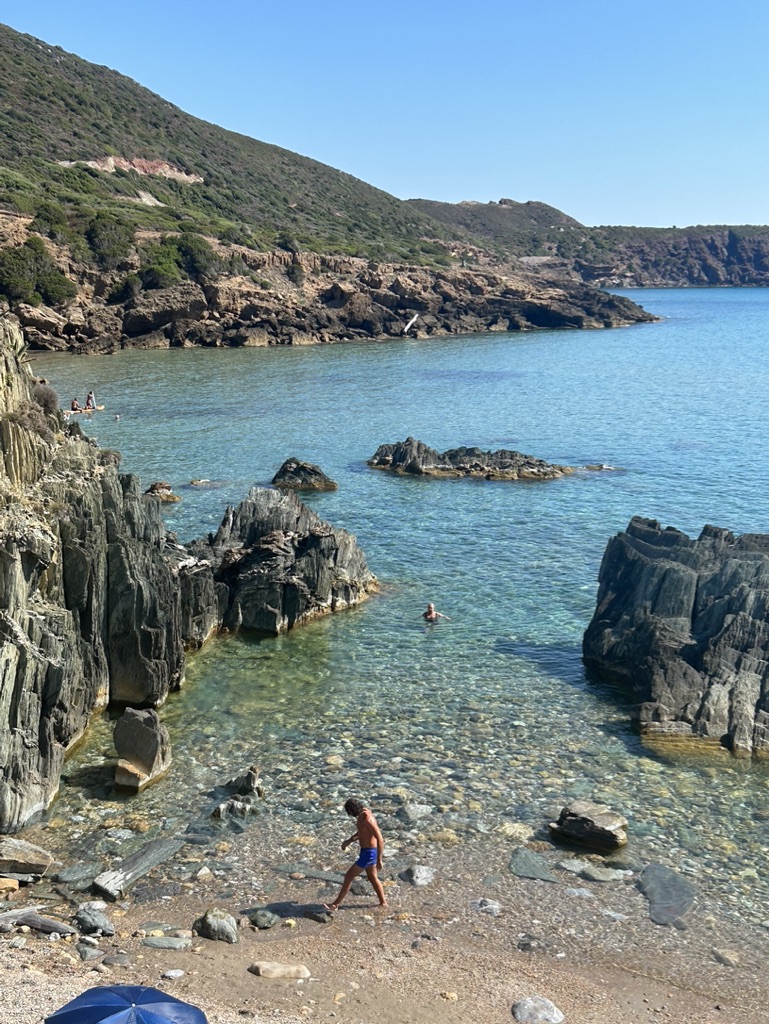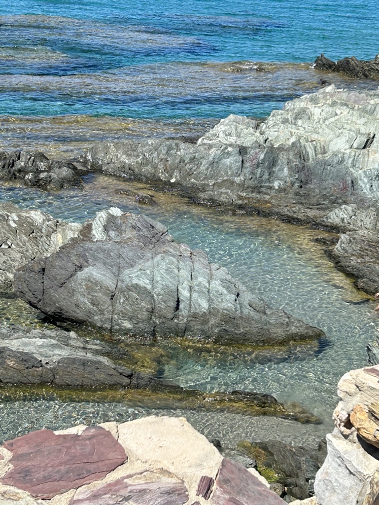 Water clarity was excellent. Sparkling like crystals. Although a bit fresh getting in it was delicious once wet and super deep right off the shore. Two steps and it was up to my armpits and the sea water was soooo super buoyant. I got a bit of a shock getting back into a swimming pool and losing that wonderful floaty feeling. The pebbly beach wasn’t exactly easy to walk or sit on, but the water was too good to resist and we swam every day. Brilliant.